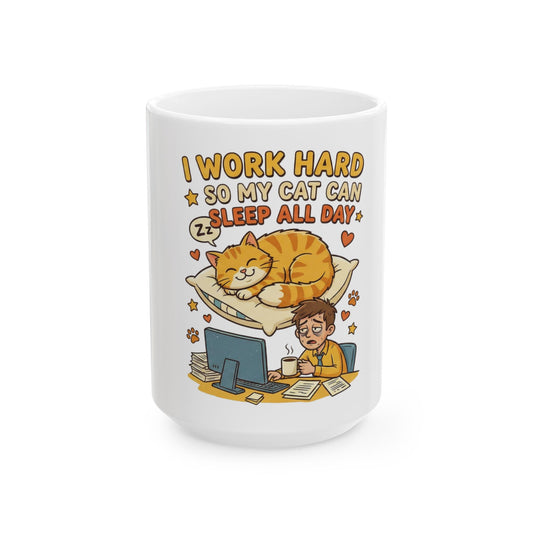 Cat Lover Mug — "I Work Hard So My Cat Can Sleep All Day" Ceramic Coffee Cup (11oz & 15oz)
